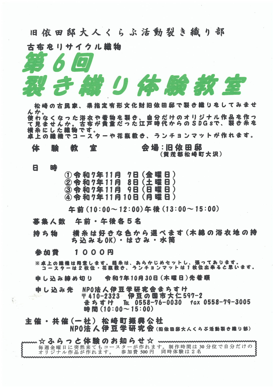 賀茂地区の高齢化の進行は時を待たず、過疎化も進んでいます。陸上交通が中心の時代に工場誘致が難しい場所柄、かつて盛んに行われていた手仕事を呼び戻すことができないか、松崎の伝統を引き継いだ裂き織りを提案させていただきました。裂き織りの今研究会副代表である曽根冨喜子先生に講師をお願いし、2017年7月から発足させました。今後、地域の発展、手仕事で寄り合う地域社会の実現を目指して、裂き織りの振興を図っていきたいと思います。合わせて、展示会を開催していきます。