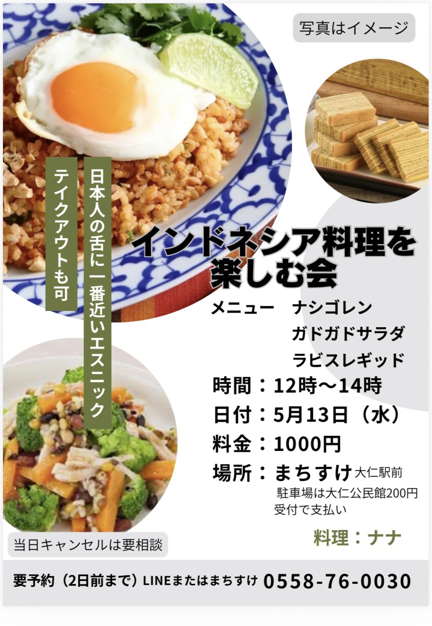 レッツまちすけ終了後、外国人による料理が食べられます。誰でも食べることができますが、予約制になっています。外国人と交流もできます。昼食にいかがですか? 12:00~14:00
