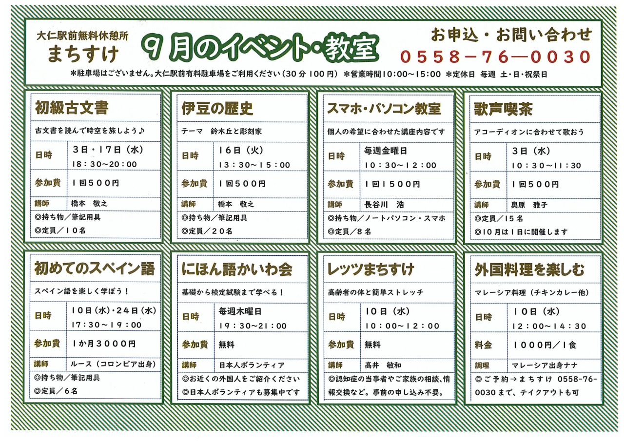 <問合せ先>〒410-2323静岡県伊豆の国市大仁597-2まちすけTEL:0558-76-0030FAX:0558-79-3005土日祝定休(特別、臨時休業あり)コミュニティカフェ営業時間 10:00~15:00事務受付時間 9:30~15:00E-mail: izu15station@road.ocn.ne.jp