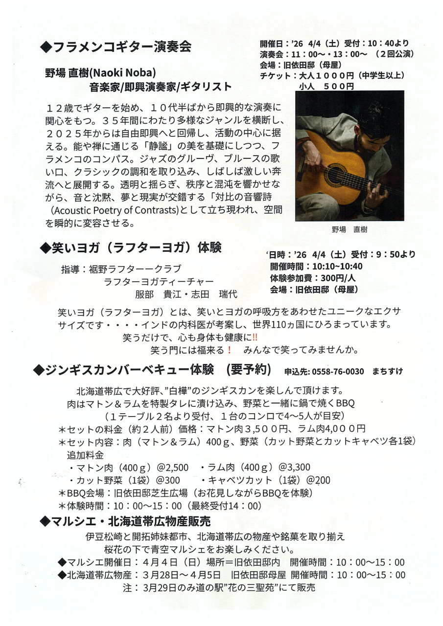 依田邸前を流れる那賀川堤防上の桜並木が満開になります。依田邸内で展示会やイベントを用意して大勢の方々をお迎えします。