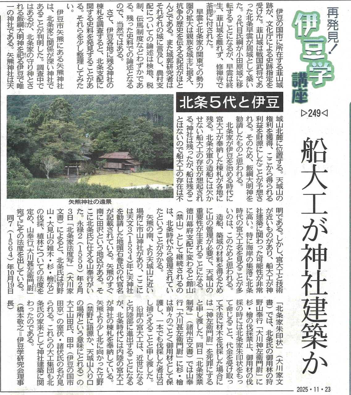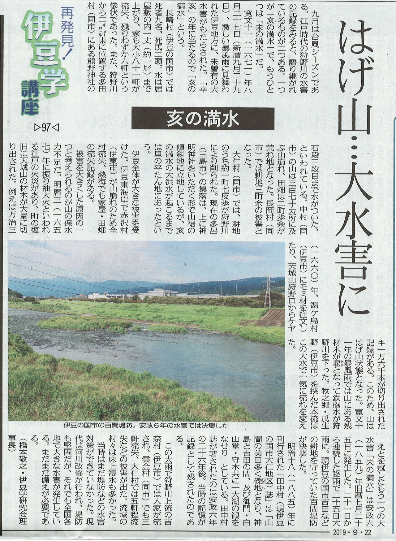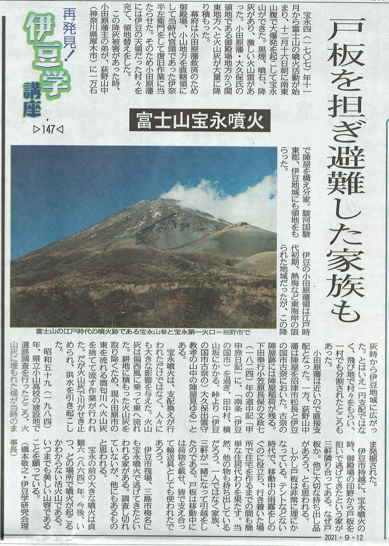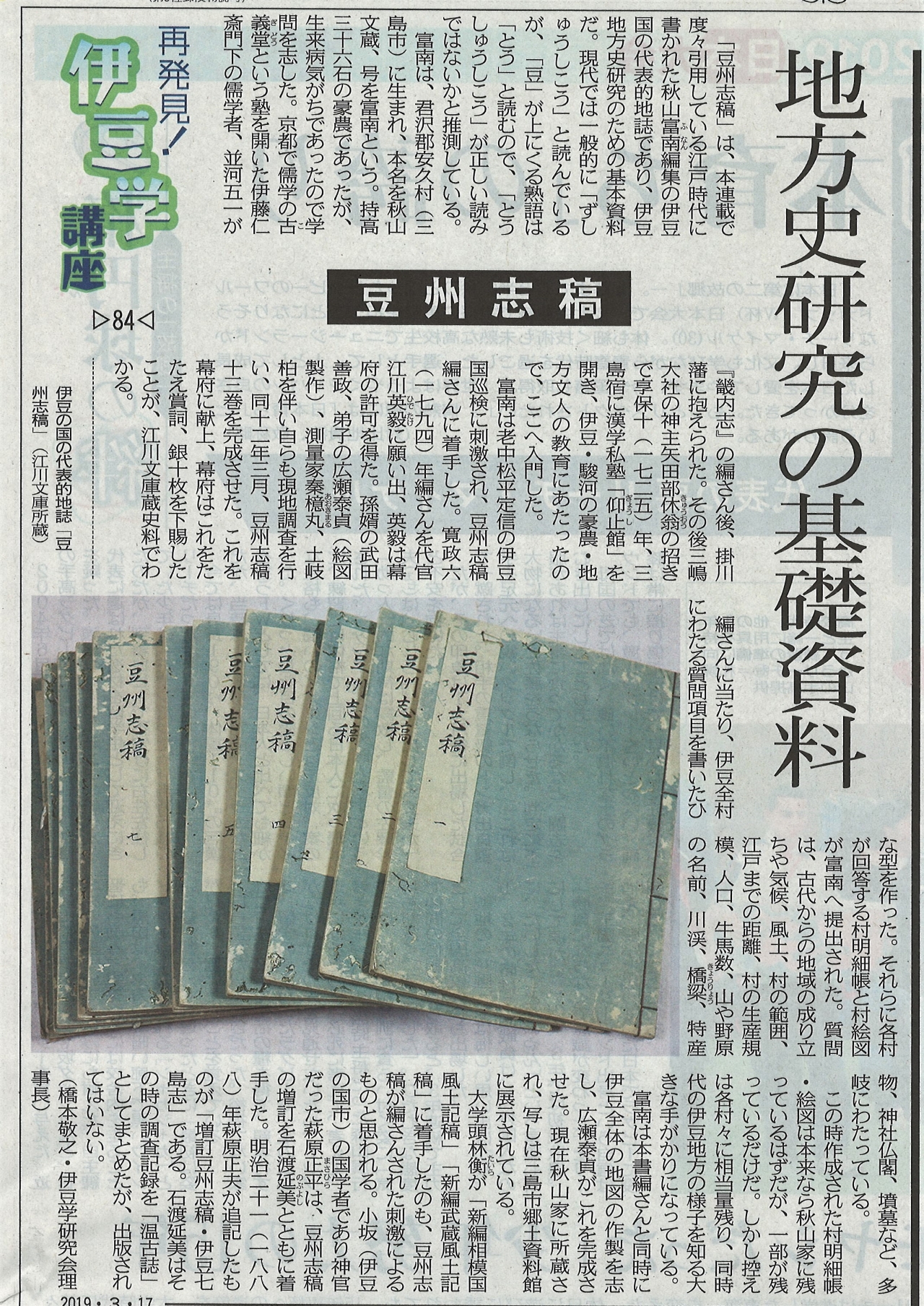 平成28(2016)年1月3日に「再発見!伊豆学講座」を「東京新聞静岡版」に掲載しました。ついで「中日新聞静岡版」「中日新聞中遠版」に掲載するようになり、現在は3紙面に同時掲載されています。隔週の企画で、伊豆全域にわたる歴史を中心とした連載となっています。