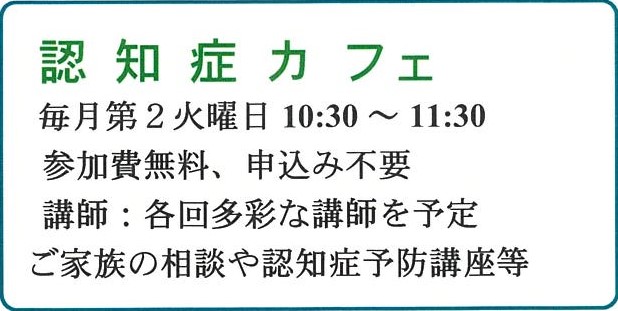 毎月第②水曜日に行う認知症カフェです。認知症について理解を深める目的で行っています。当日は包括支援センターから支援員が来て、相談に乗ってくださいます。当人自身が心配、ご家族に煩っている方がいて悩んでいる等のことがあれば、足を運んでご相談ください。