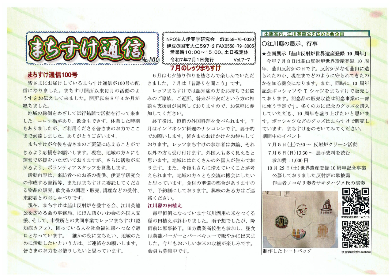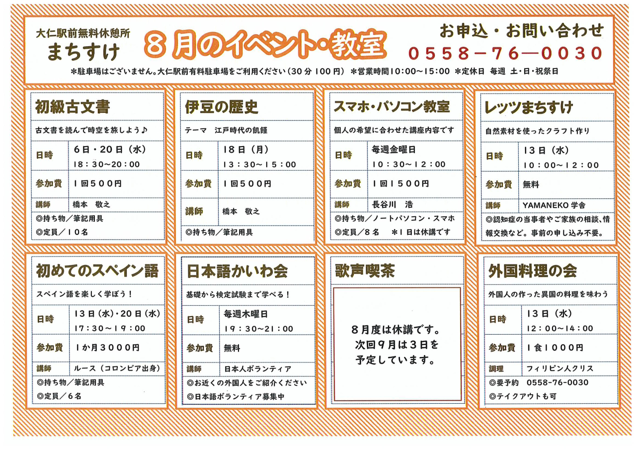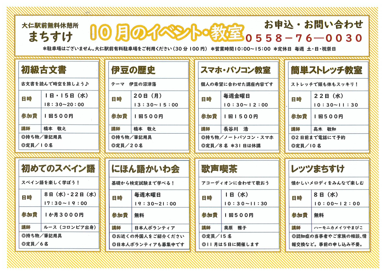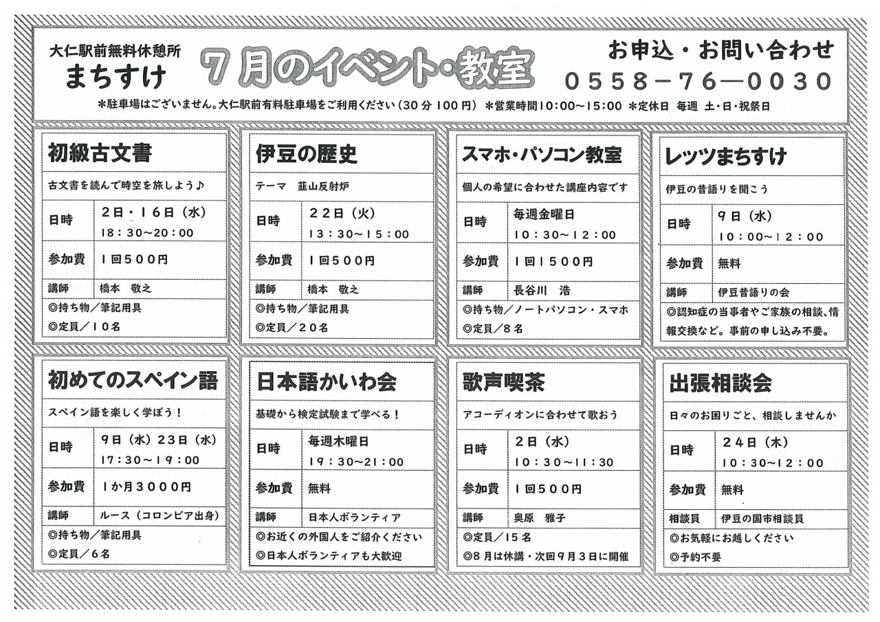 <問合せ先>〒410-2323静岡県伊豆の国市大仁597-2まちすけTEL:0558-76-0030FAX:0558-79-3005土日祝定休(特別、臨時休業あり)コミュニティカフェ営業時間 10:00~15:00事務受付時間 9:30~15:00E-mail: izu15station@road.ocn.ne.jp